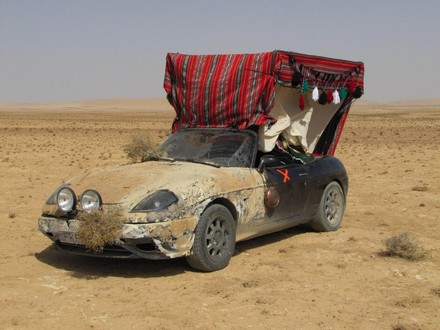 Richard Hammond was pleasantly surprised by the reliability of his Fiat Barchetta although the missing ‘buttock’ didn’t make for comfortable driving. Note the bits of actual desert carefully applied to the front of the car by smearing it in glue and then throwing sand at it, and the remnants of the Bedouin tent to the rear of the vehicle.