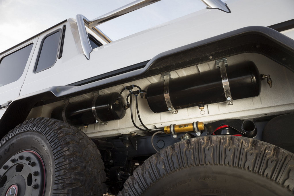 To maximize the G63 6×6 off-road capabilities, AMG has fitted it with 37-inch tires, portal axles, tire pressure control system and a special chassis featuring adjustable gas-pressure shock absorbers.