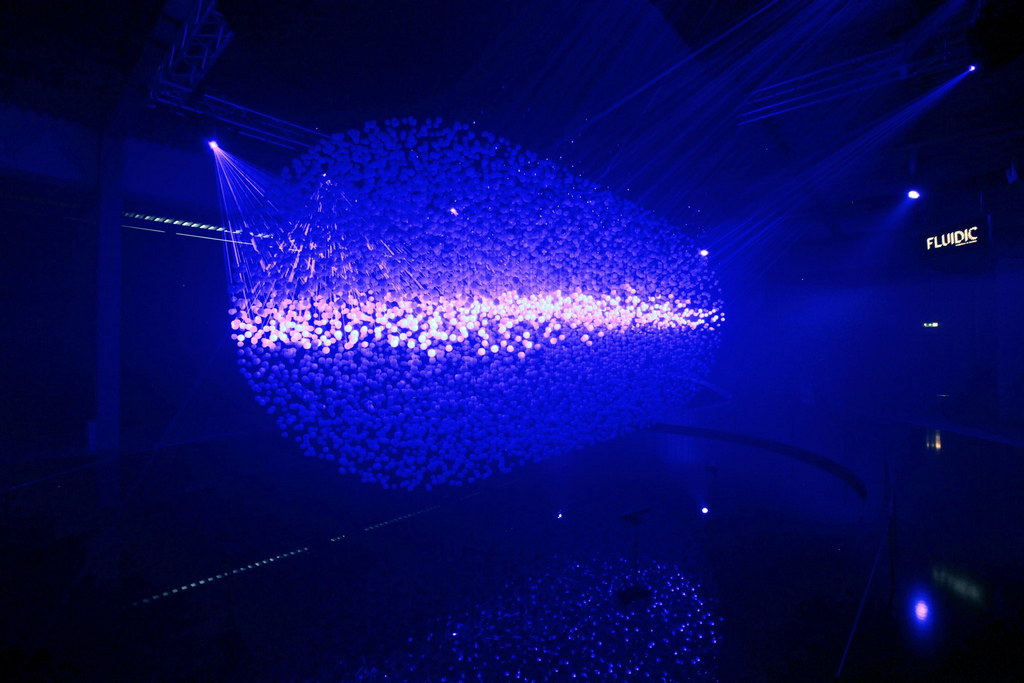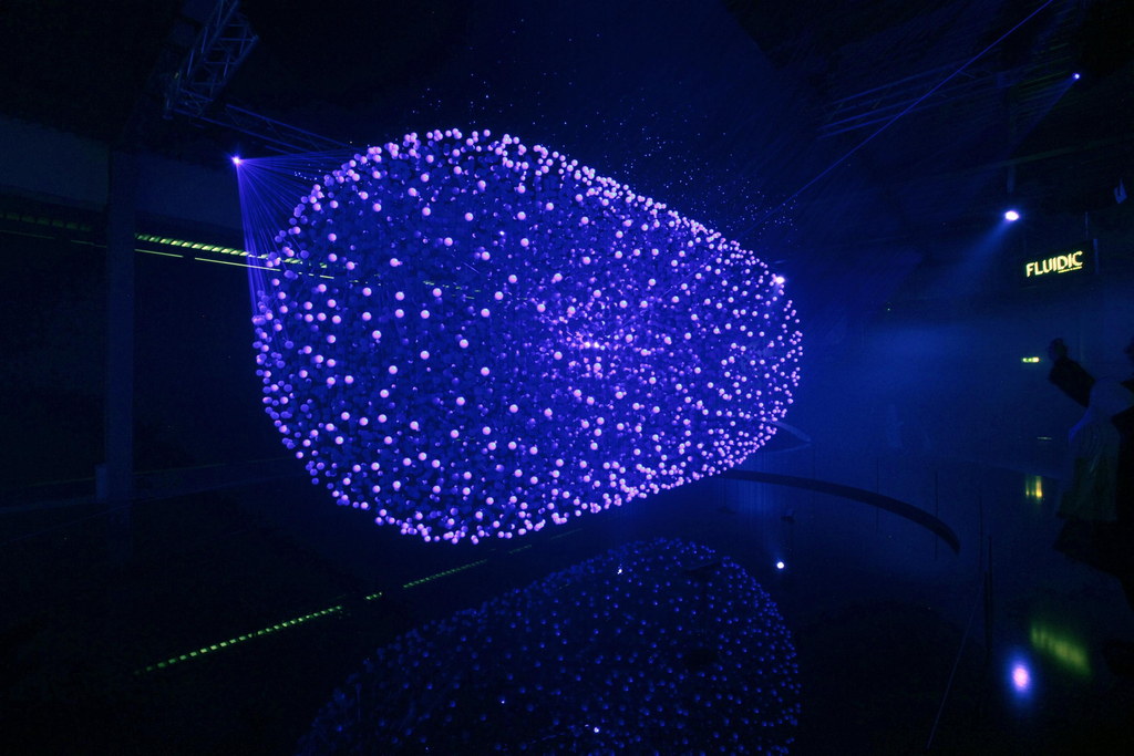 Occupying 1,000 square metres, the light sculture is made up of 12,000 translucent spheres, acting collectively as a screen, surrounded by eight high-powered lasers and suspended over a pool of water. It even uses a special 3D scanning system that registers body warmth, allowing visitors to explore and manipulate the installationby usingtheir gestures to createcurves and shapes. That is pretty cool.