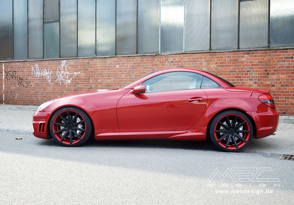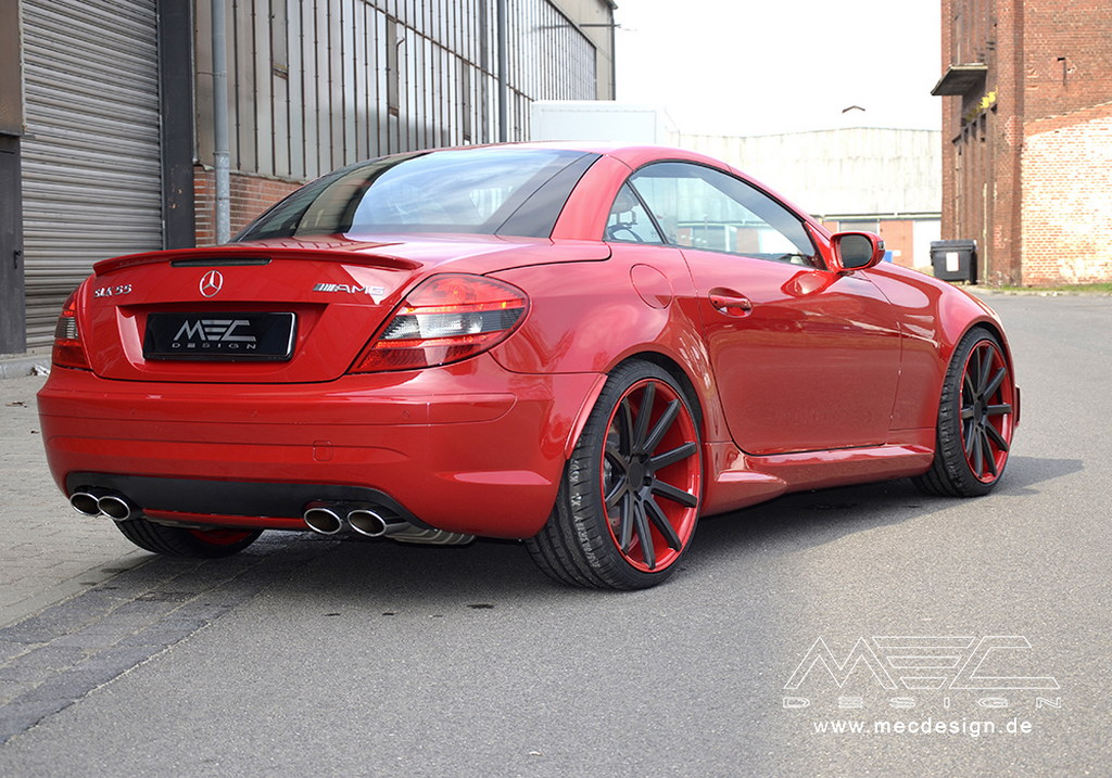 Anyways, let’s the R171 by MEC Design. The tuner has done many good things to the SLK55, improving its style, handling, and driving fun. The treatment begins with installing a set of ConDeni Nobilis 1 piece wheels. They measure 8,5×19 front and 9,5×19 rear, and have a special black finish with red lips that match the color of the exterior.