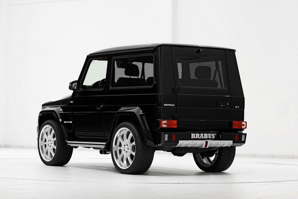 The styling kit on the Brabus Mercedes G500 SWB includes steel and silver accents for the front bumper, LED lights and blinkers, Brabus front grille, vented hood, fender extensions, steel running boards, new side exhaust pipes, and new rear bumper with a diffuser insert and unique LED lights.