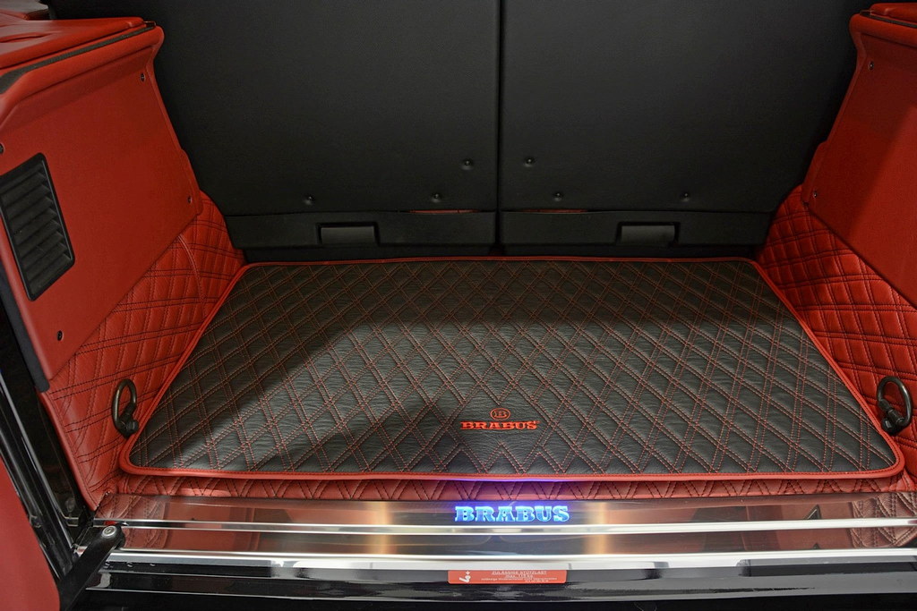The interior features a two-tone red and black leather package contrast stitching and Brabus logo, illuminated side sills, leather headliner and floor mats, and sport steel pedals.