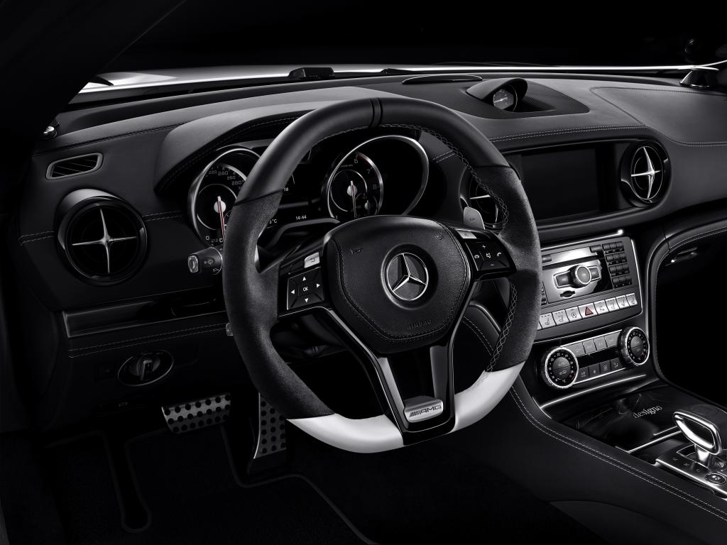 Mercedes SL 2Look Edition comes with a range of light-coloured paint finish, such as designo magno cashmere white, designo diamond white bright, tenorite grey or iridium silver, with a vario-roof in high-gloss black. The paint work is complemented by two available set of 19-inch AMG wheels in high-sheen finish.