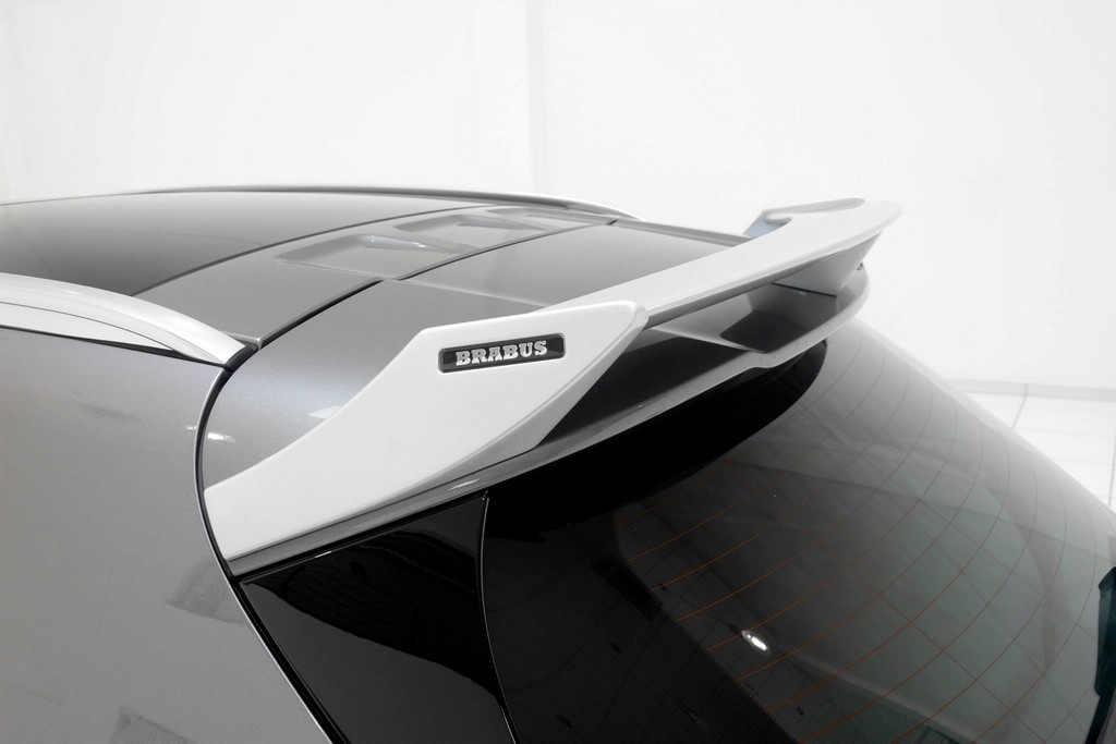 On the sides the only thing that draws your attention is a side skirt modeled on the front spoiler. But around the back we have the add-on part mimicking a diffuser with a quad tailpipe system. Brabus has also designed a very cool roof spoiler for the GLA which fits on top of the stock unit.