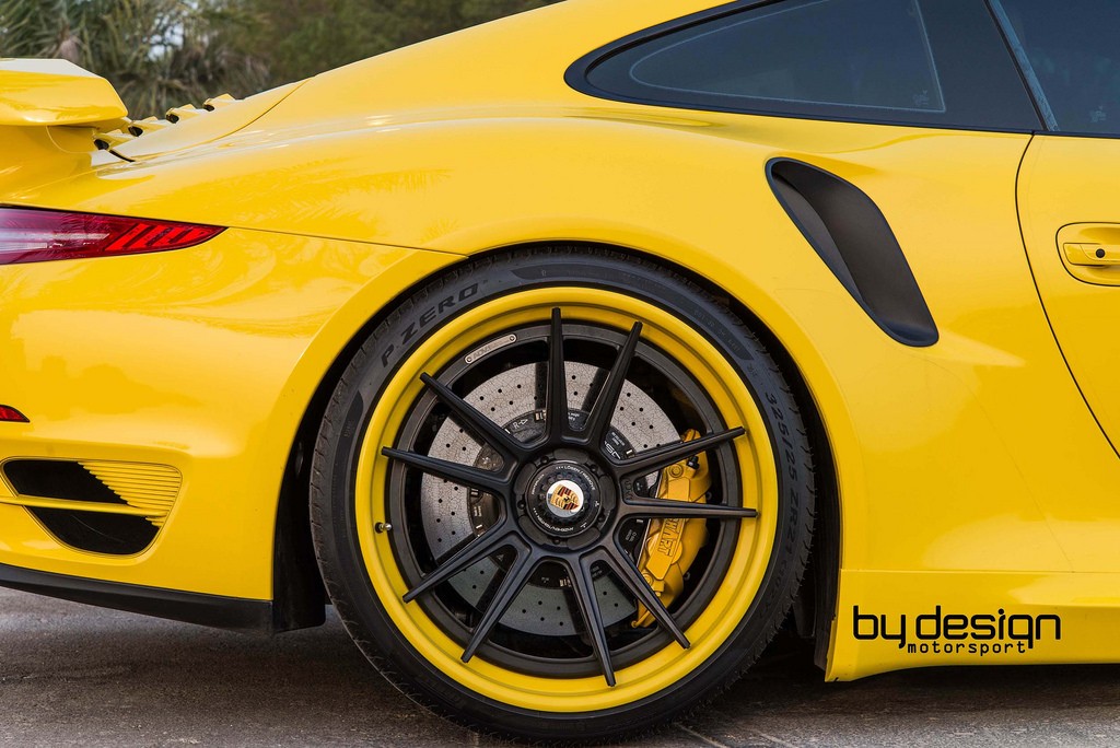 ByDesign Porsche 991 Turbo S is equipped with a set of ADV5.2 TS SL finished in matte black with race yellow lips to match the style of the car. They measure 21×9.5 inch up front and 21×12.5 inch out back.