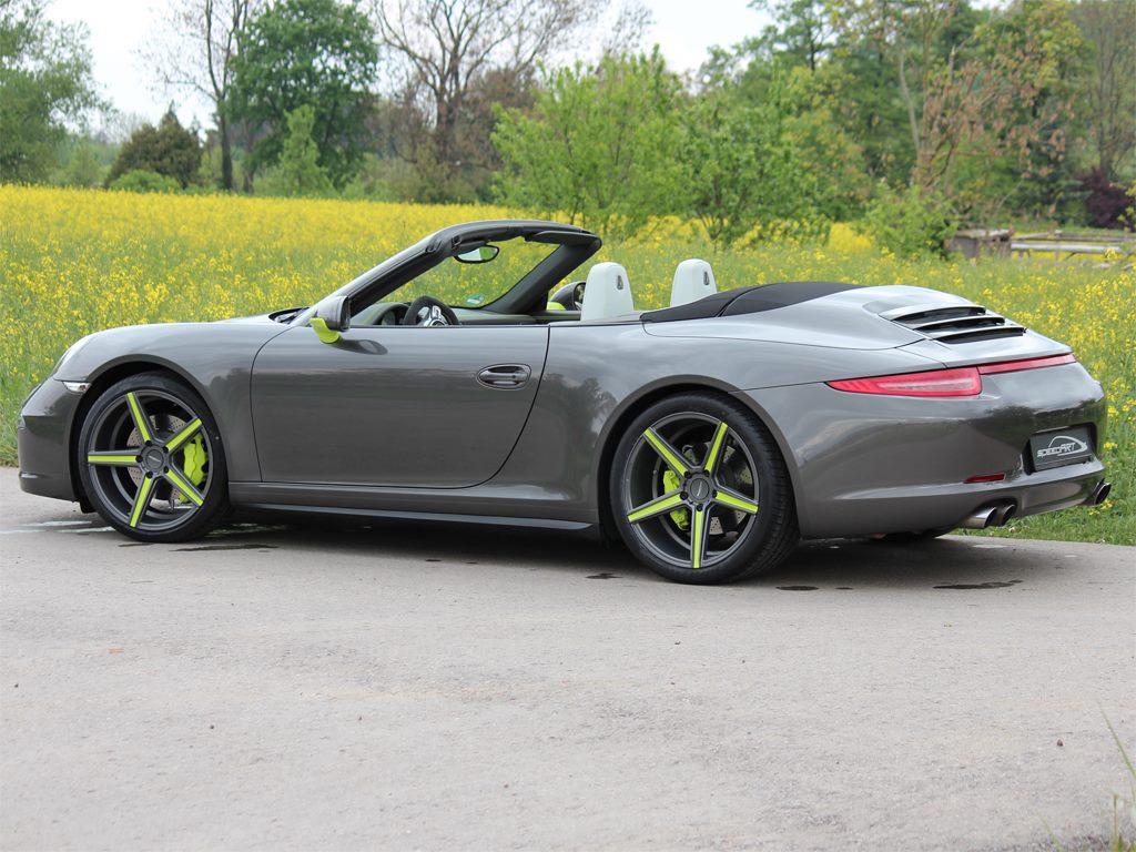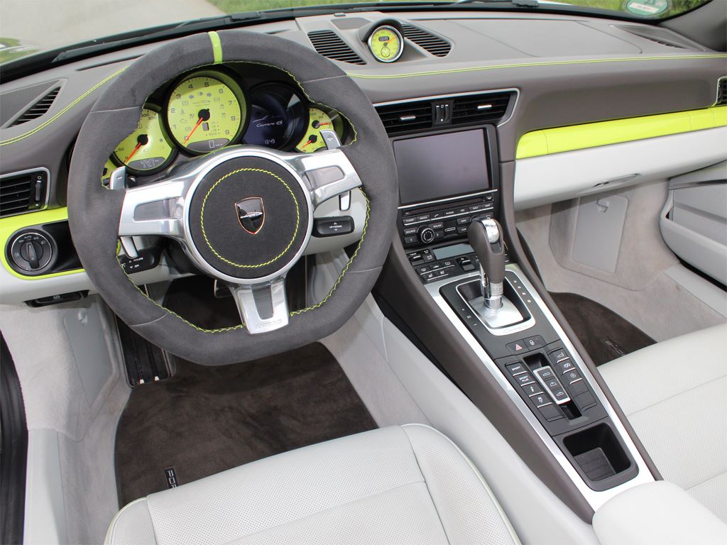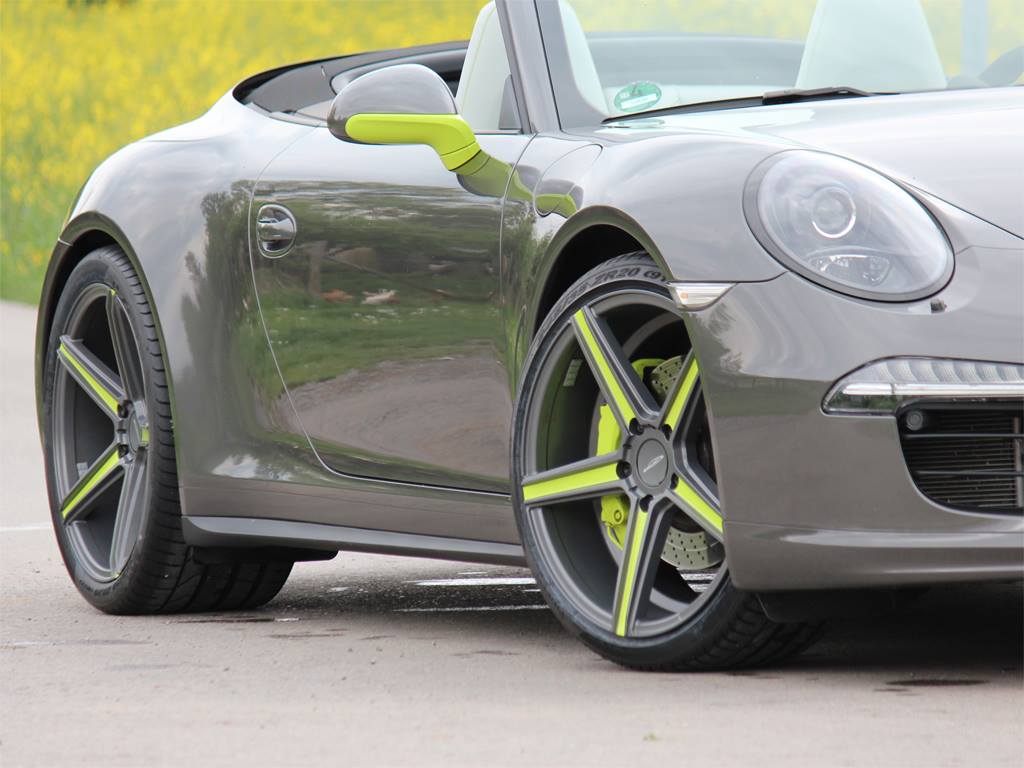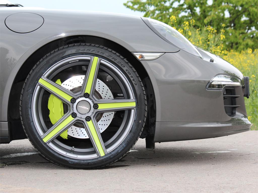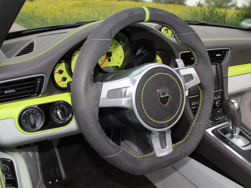 The highlight of SpeedART Porsche 991 Carrera, known as SP91-R 430 package, is the “acid green” accents featured inside and out. On the outside, you find this color on the mirrors and the wheels and brake calipers.