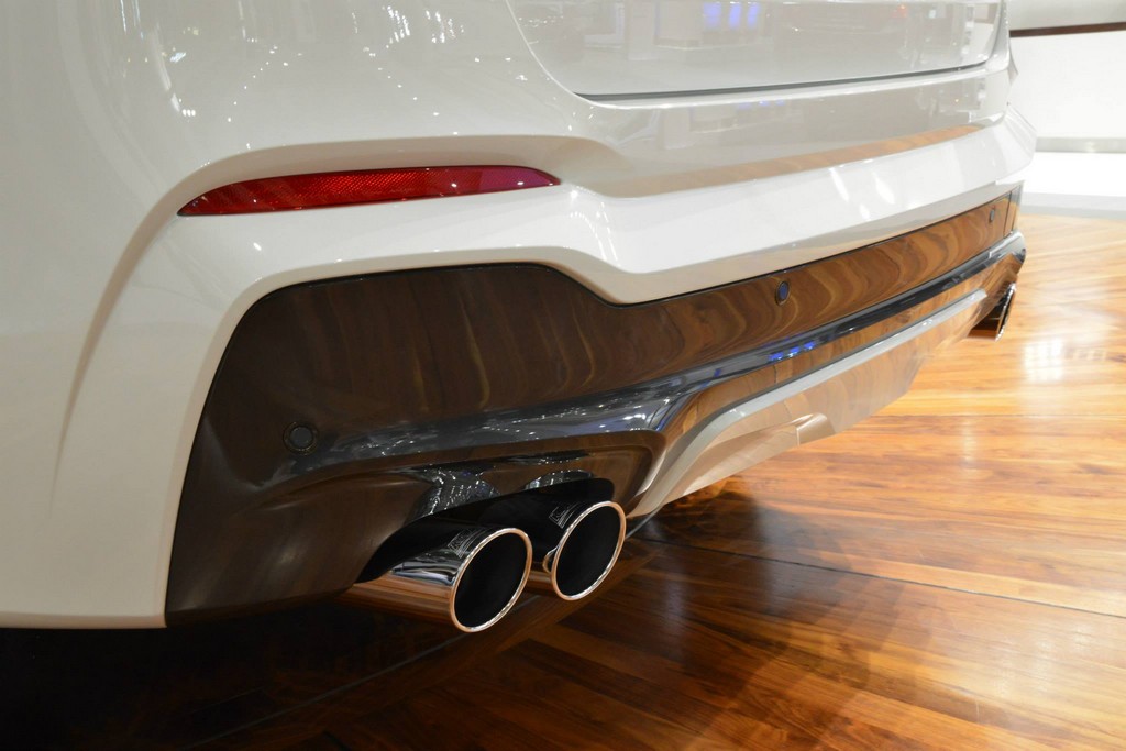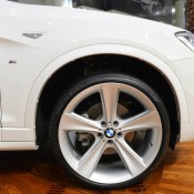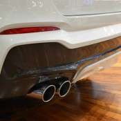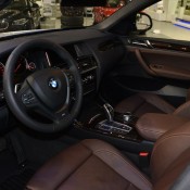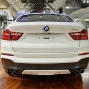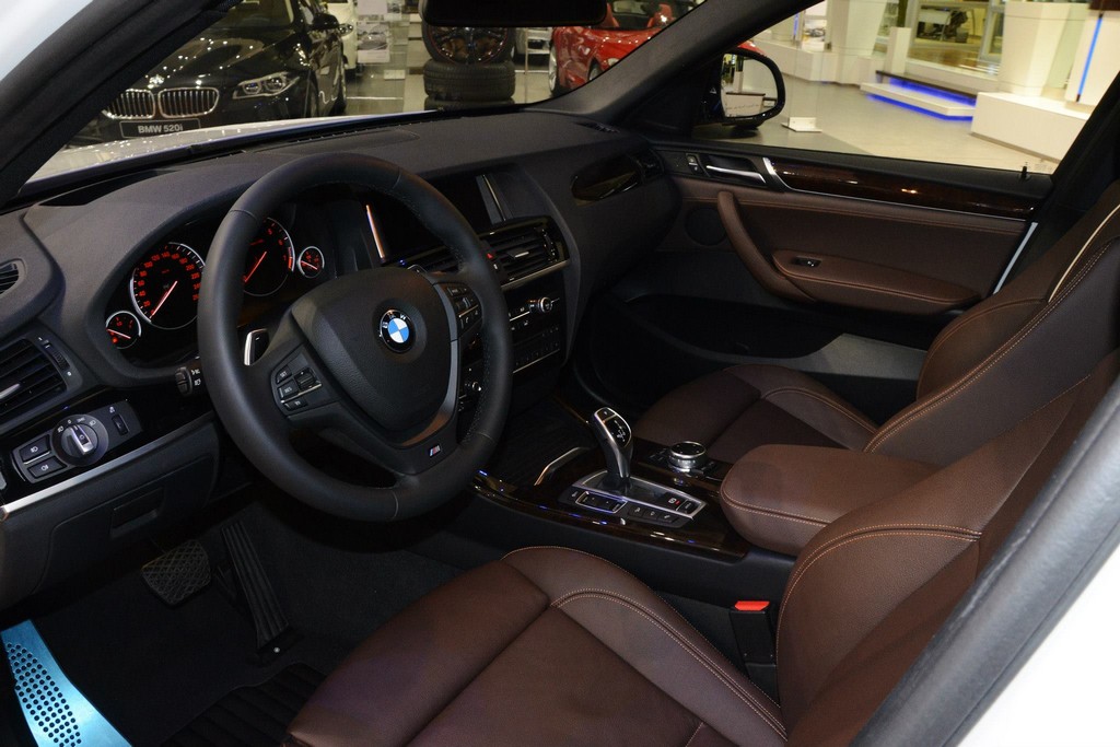 Shown here in white and in xDrive35i guise, the BMW X4 M Sport comes with M Performance Parts front and rear bumpers including grille inserts and black apron, side skirts, rear diffuser, and four shiny steel tailpipes. Inside brown Merino leather upholstery combined with the black dashboard results in a classy environment.
