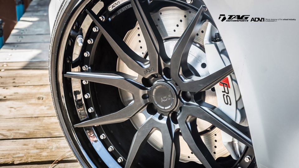 The wheels on this Audi RS7 are ADV5.0 Track Spec CS Series in size 21×10.5 all around. They are finished in matte black with gloss black lips, and feature titanium ADV1 logo. The color is the perfect complement for the blacked-out roof and the car’s exposed carbon fiber parts.