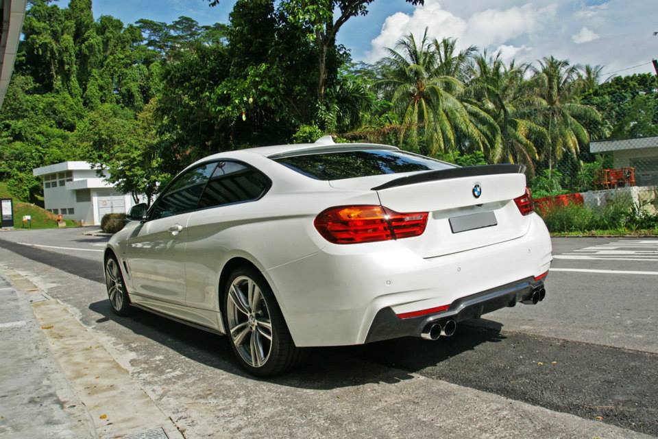 KBS Motorsport BMW 435i shown here features a carbon fiber body kit by Japanese tuner 3D Design, consisting of front spoiler, side skirts, rear diffuser with quad outlet, trunk spoiler and roof spoiler. The kit fits on the 4er’s stock bumpers and sills and give it a lower, sportier stance.