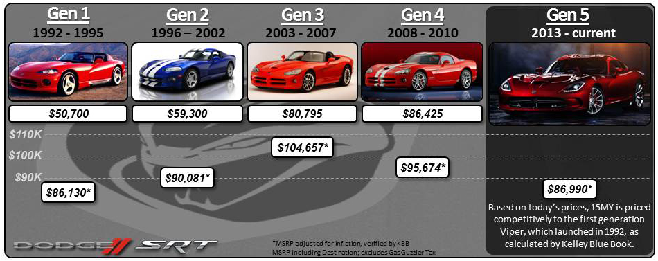 Looking for some sort of solace in this affair, Dodge marketing people found out this price, adjusted for inflation, is what a first generation Viper, which launched in 1992, would cost today. It hardly makes the 2015 Dodge Viper more appealing in the eyes of a buyer, now does it?