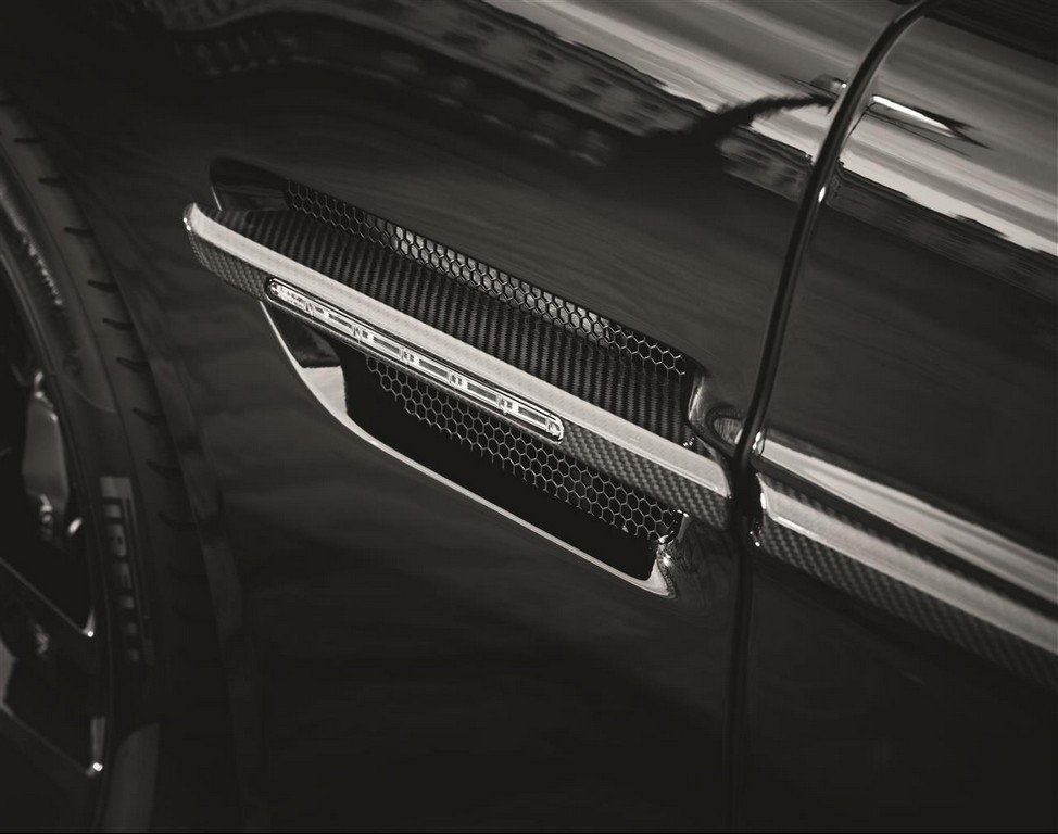 Some of the styling features on Aston Martin Vanquish Carbon Edition are quite subtle, but they make a huge impact on the way it looks. The black side window surrounds or the black headlight eyebrows are among these features. There is also a set of new 10-spoke gloss black wheels which look fantastic – much better than what you get with the standard Vanquish.