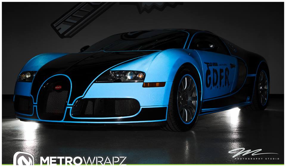Hip Hop artist Flo Rida has apparently grown out of his affinity for shiny objects, replacing the gold wrap on his Bugatti Veyron with a Tron-inspired theme to promote his new song GDFR (Going Down for Real). Flo’s Tron-Bugatti is wrapped by the guys at Metro Wrapz in Miami.