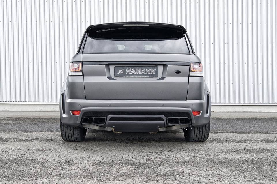 The 2014 Hamann Range Rover Sport styling kit includes a full set of components designed to make the RR lower, wider, and more formidable looking. It consists of a front bumper widebody 3-piece with 2 fibre-optic daytime running lights, set of wide front fenders, 6-piece side panel set, 5-piece rear extension kit, and 2-piece rear bumper including silver anodized tailpipe covers in special optics.