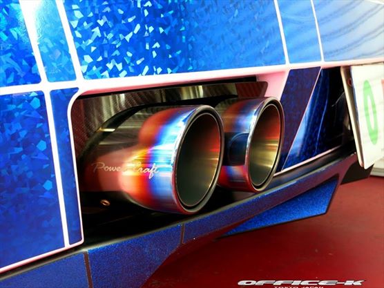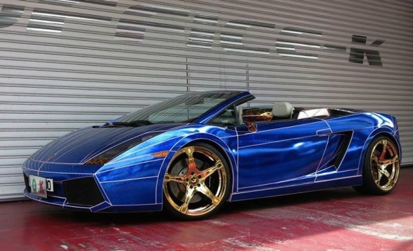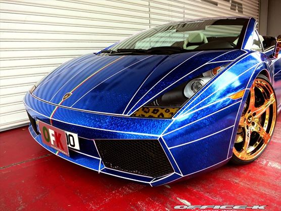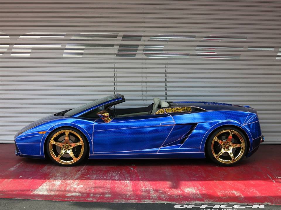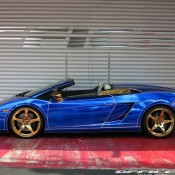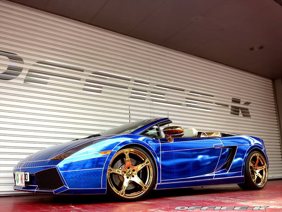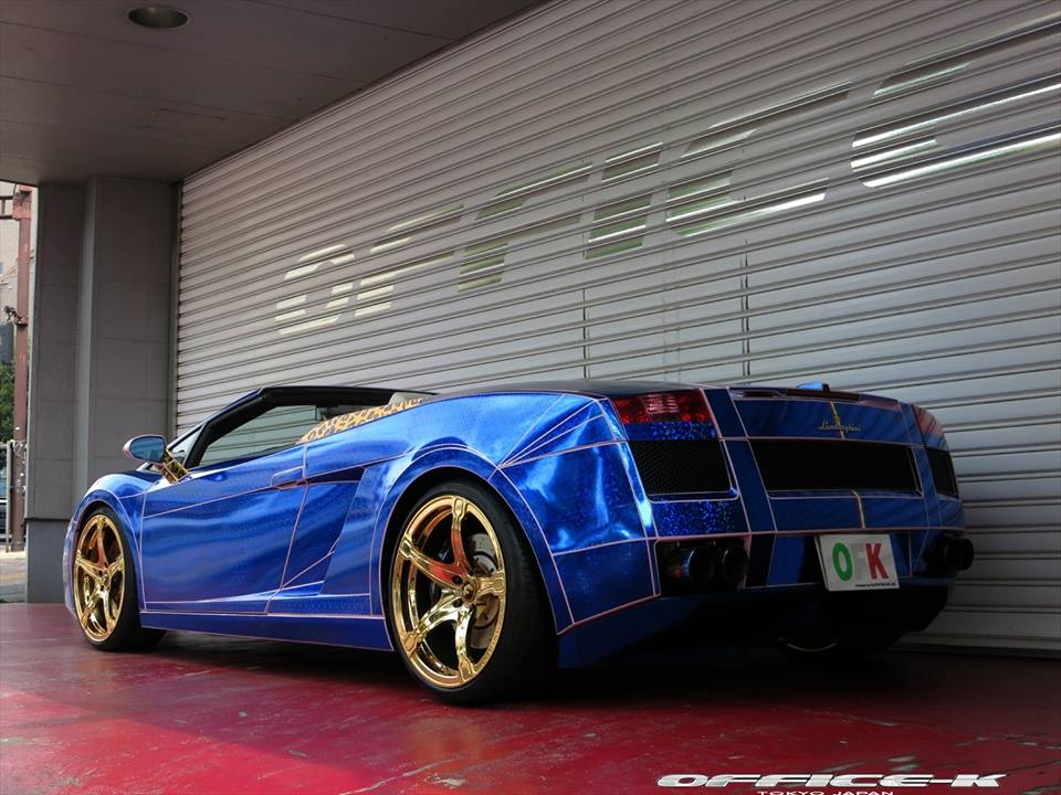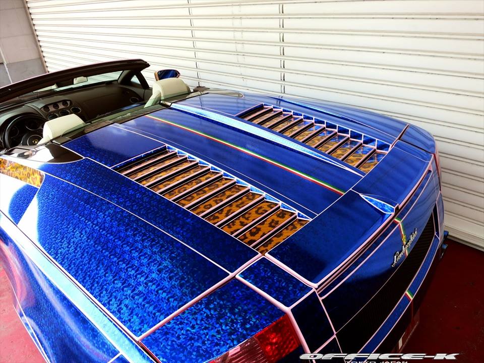 Morohoshi’s Lamborghini Gallardo Spyder is wrapped by Office-K with a unique textured film. The Tron-style wrap features a blue base garnished with flakes and golf lines, and complemented with leopard pattern accents. A set of gold Forgiato wheels and a sport exhaust system are among the other custom bits we can see in the pictures OFK released on their Facebook without any description.