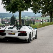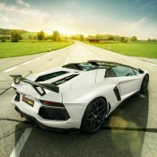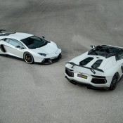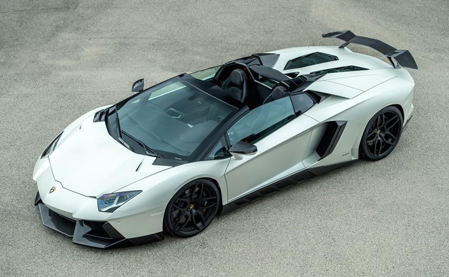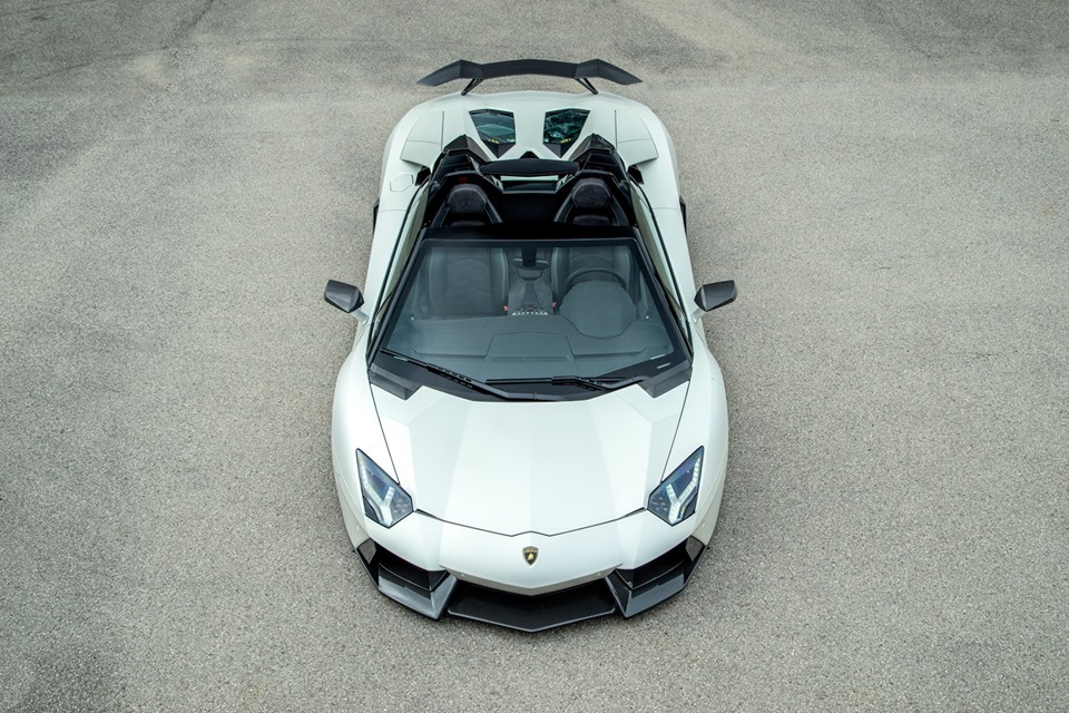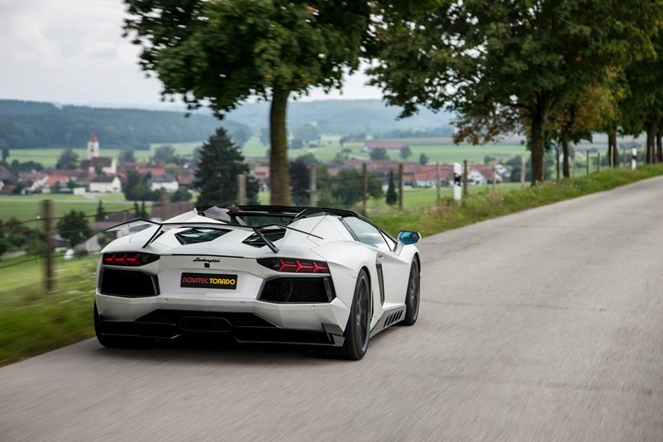 Novitec Torado Lamborghini Aventador Roadster styling kit consists of a front spoiler flanked by new air ducts on the side and a strut, carbon trunk lid with air vents, carbon mirror caps, side panels, aide window air intakes, roof scoop, bespoke engine cover, rear double diffuser and fixed rear wing in single or double configuration.