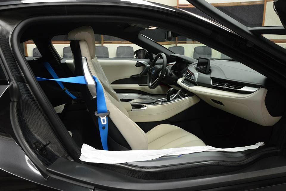This Sophisto Grey BMW i8 features the usual blue accents standard on all i8s, garnishing the front grille, side panels, rear bumper and bits of the interior. If you don’t like that, you should check out Manhart’s take on the i8. They have painted these parts yellow!