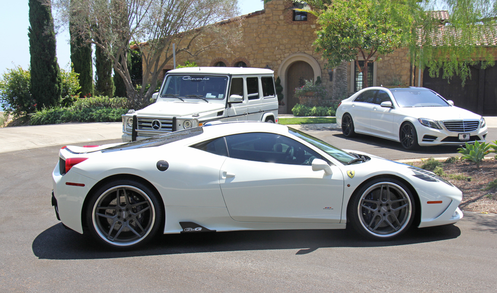 Giovanna’s white Ferrari 458 Speciale benefits from a range of carbon fiber accessories including fender vents, headlight bezels, side aero blades with extra winglets, rear apron and rear diffuser. Then there is the one of a kind blue stripe the complements the white exterior color perfectly. The car would have looked absolutely amazing even without the wheels, but those GFGs complete the work and accent off the nice details of the body.