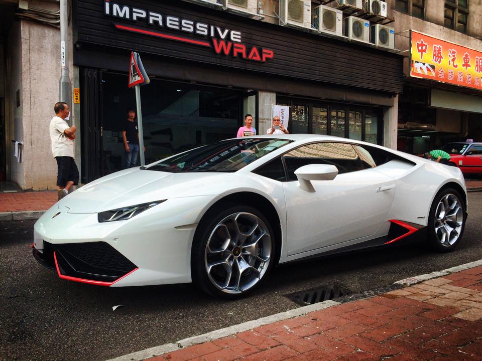 What they’ve done is wrap the while thing in glossy protection film, then blacked-out the aero parts, and then accented those black parts with a glossy red, like lipstick. You find the accenting on the front grilles, side air intakes, and around the taillights.