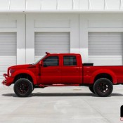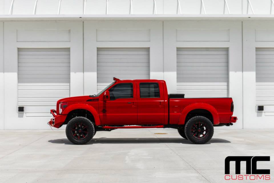 This red monster you see here is a one of a kind Ford F-250 super duty truck, customized by the guys from MC Customs. The standard F-250 is a pretty scary bit of kit, but this one with all the extra bits and that special color is just off the hook!