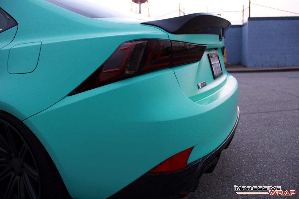 The matte mint Lexus IS is the work of Impressive Wrap, known for their love of weird and interesting colors. This unique greenish color is actually a shade of blue called Tiffany Blue, and it works great when teamed with carbon fiber aero parts such as the front spoiler and rear diffuser, and the blacked-out roof.