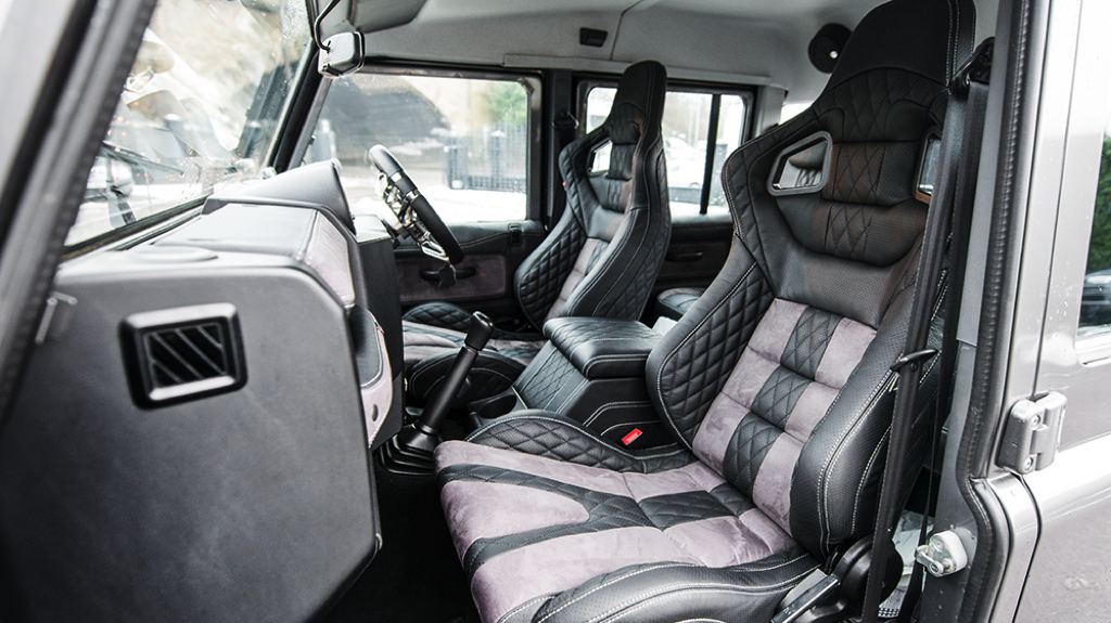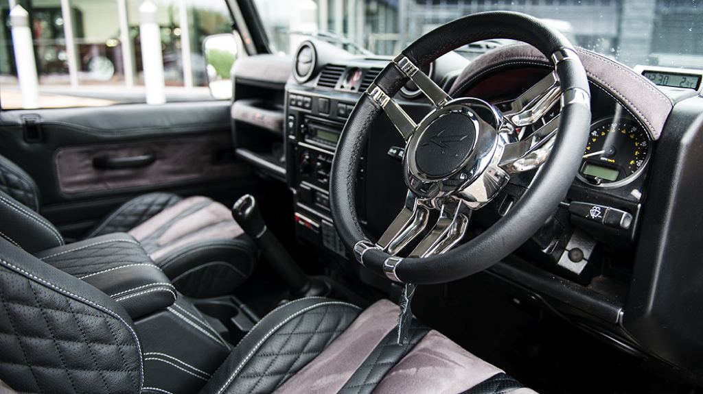 Inside the cabin, the agricultural feel is gone and replaced with cool and crisp look thanks to GTB seats in quilted and perforated leather, Churchill Time Clock and speedo/rev counter facia insert in Red, Kahn billet steering wheel, instrument binnacle in leather, hard wearing front and rear cabin floor mats, interior trim detailing in Alcantara, vented foot pedals in machined aluminium and door cards in black leather.