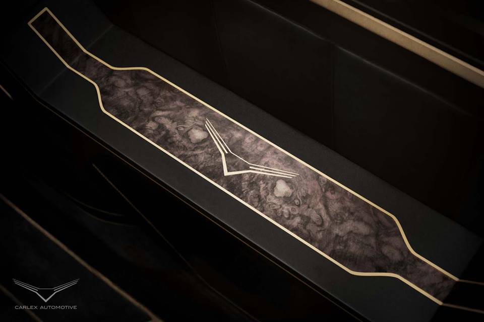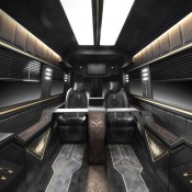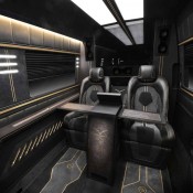 Carlex has gone for a dark and moody, espresso bar kind of look for the Sprinter’s cabin with black leather and suede upholstery, gold stitching and piping, dark walnut wood trim pieces and foldable tables, gold accents in the walls, unique lighting system, and special floor mats. The big van is basically equipped for just two VIPs who will enjoy two large reclining chairs, as mentioned with tables and cup holders, and they will be able to control the features of the car, including a kickass entertainment system, from a main control screen in front of them.