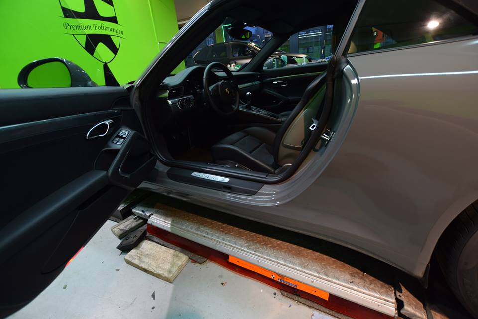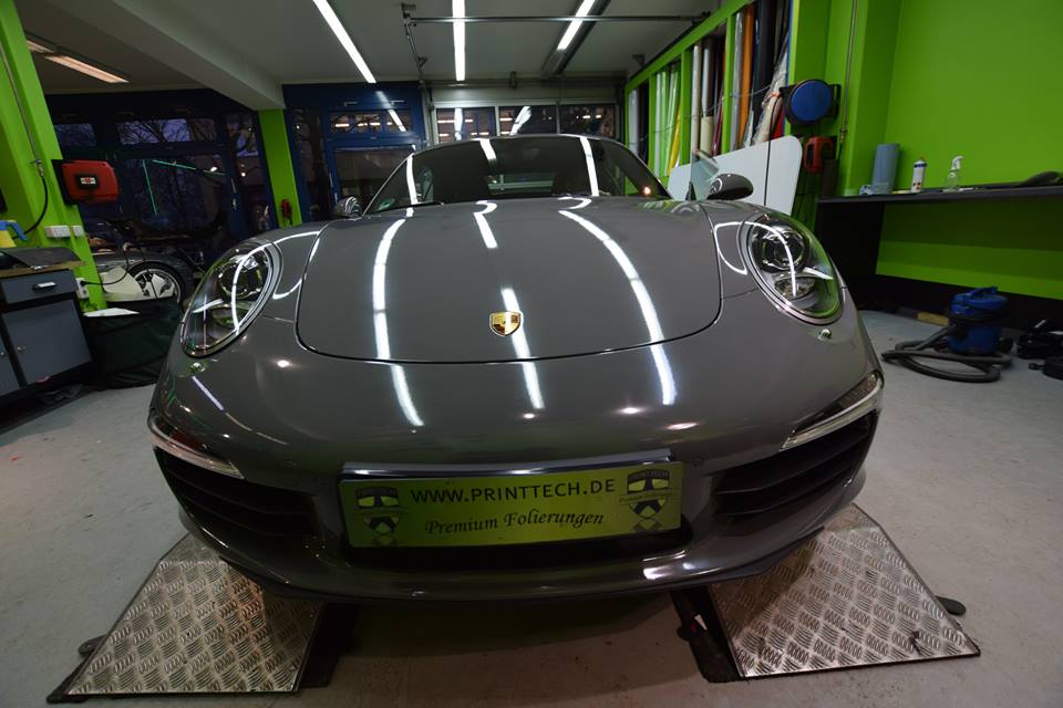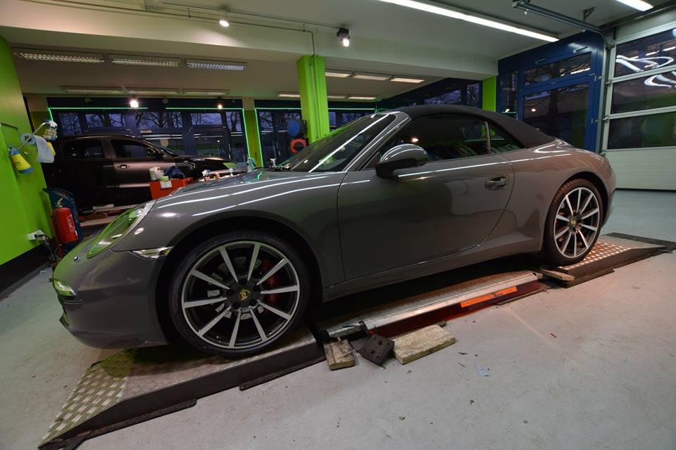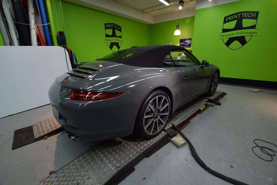 The whole purpose of wrapping a car is to rid it of the standard boring color and give it a shiny new shade chrome or pearl of whatever takes the owner’s fancy. But every once in a while you find a fellow who wants to it the other way around; that is, he has a car with a shiny color, and wants to change it for a solid, sober color. That is the case with this Classic Grey Porsche 911 Cabrio.