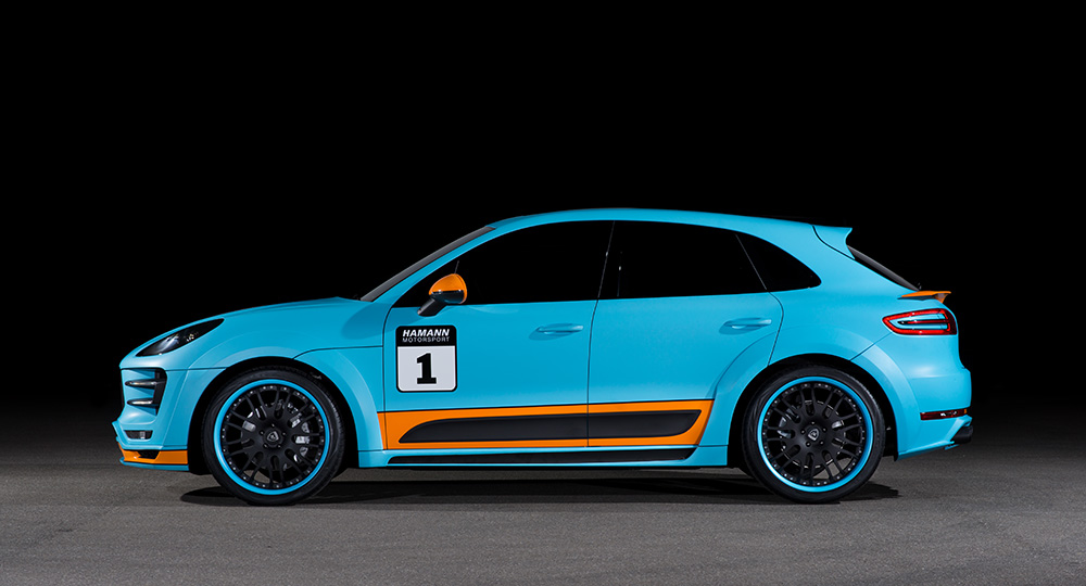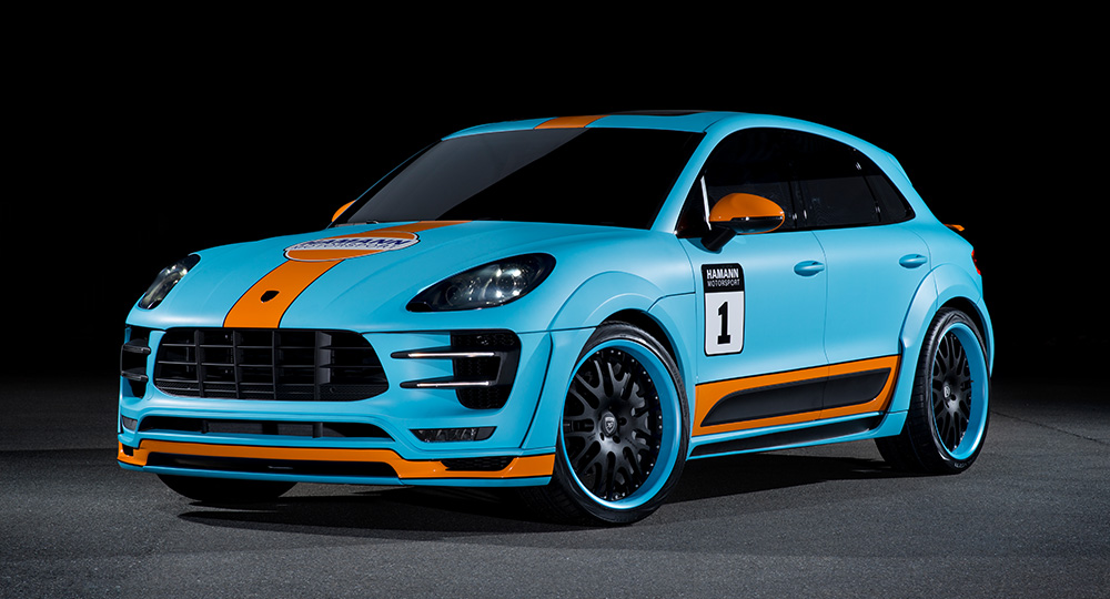 Based on the Macan S Diesel, the handsome Hamann Porsche Macan Wide Body turned up at the Geneva show wearing a distinctive Gulf livery. A small crossover with a diesel engine is the last car you would expect to see wrapped in these legendary colors, but you have to admit it looks pretty impressive.