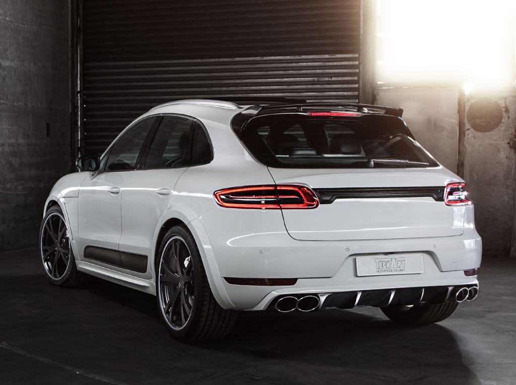The ingredients of the aero kit for Techart Porsche Macan, on the Turbo model, include a large chin spoiler complete with carbon lip and extra LED lights, carbon mirror caps, side sills, roof spoiler, tailgate spoiler, and a neat rear diffuser with cutouts for four prominent tailpipes.