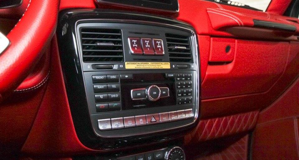 The completely re-upholstered interior on this G65 features red quilted leather with contrast stitching on pretty much every visible surface, plus Brabus steering wheel and shifter, sport pedals, and gloss black trim pieces.