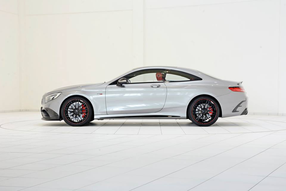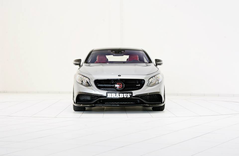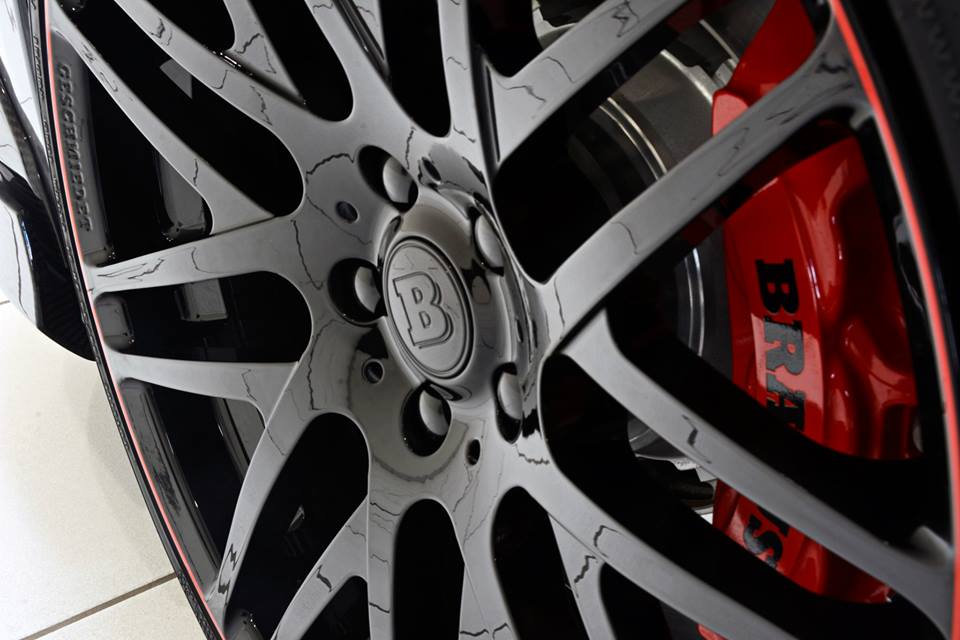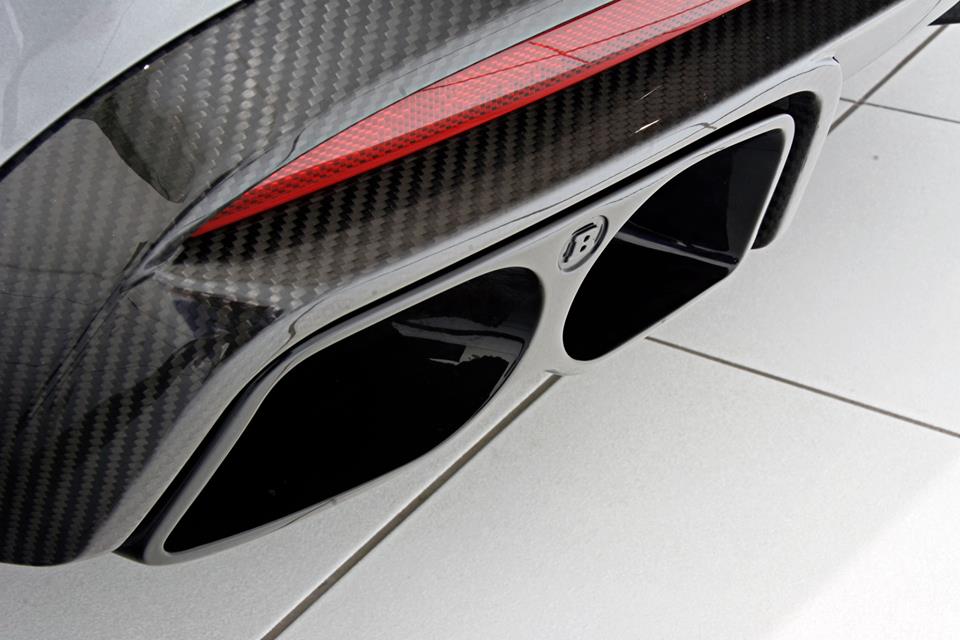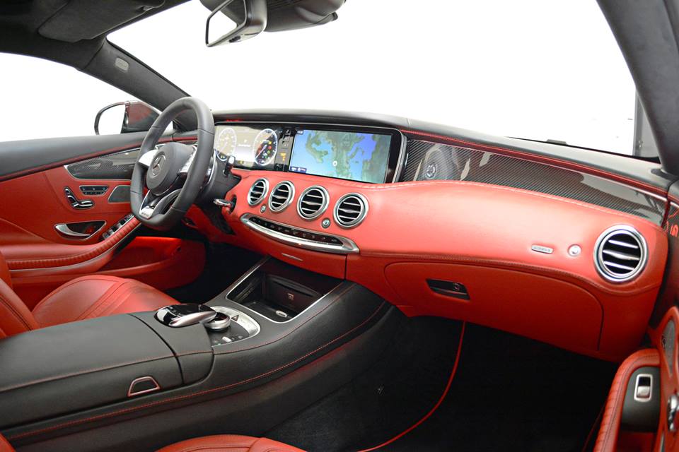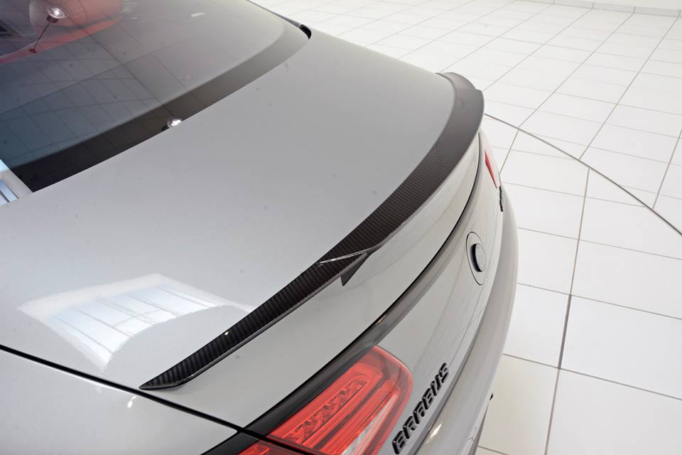 The styling package for the Brabus S63 Coupe consists of a large front spoiler, custom Brabus grille, side skirts, carbon mirror caps, boot lid spoiler, rear air ducts, and rear diffuser with integrated tailpipes. All the parts, needless to say, are carbon fiber. The kit is complemented with a set of gloss black Brabus Monoblock wheels with red outer lips and red brake calipers behind them.
