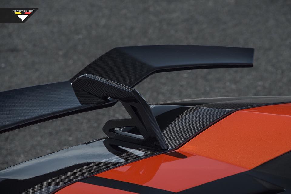 As for the ingredients, Vorsteiner Lamborghini Aventador Zaragoza styling kit consists of a front spoiler, side skirts and vents, rear diffuser bumper, and the rear wing we have already mentioned. Perfecting the effect of this PrePreg carbon fiber kit – a special sort of carbon fiber that is stronger and has cooler carbon weaves too – is a set of 20-inch VTM-350 wheels in matte black and complementing those is an adjusted suspension system. Roadster models also get a blacked-out roof.