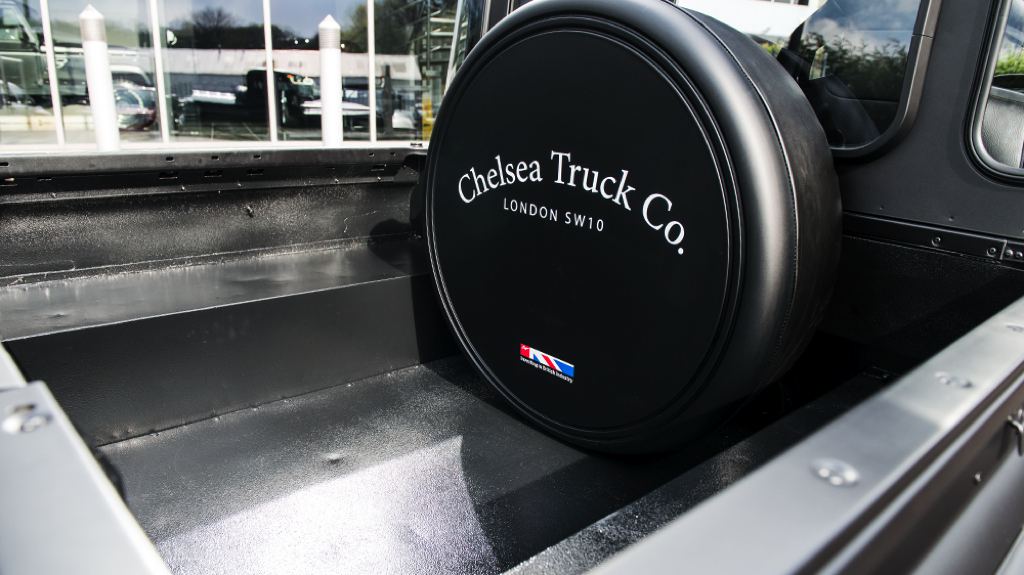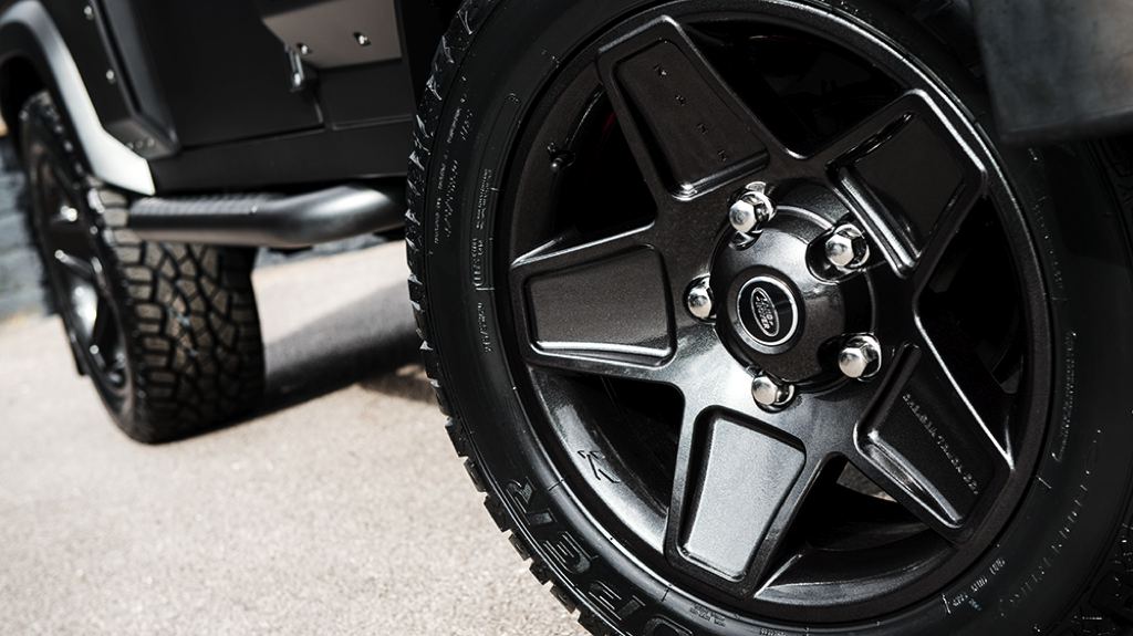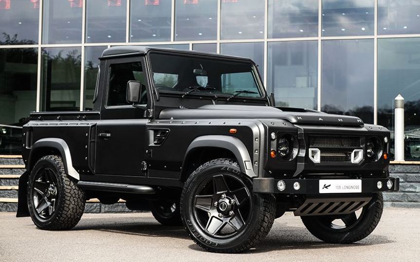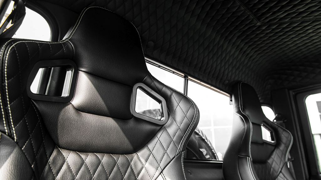 At any rate, the styling treatment on the Flying Huntsman Defender Pickup includes front and rear wide wings with vents and bolt apertures, extended wheel arches, bonnet release cable, front bumper replacement including bumper lights and sump guard in stainless steel, shadow chrome headlamps, front bumper replacement with bumper lights, bonnet and side vents with mesh stainless steel, side steps, X-Lander front grille, 8″ x 18″ Defend 1945 Retro Wheels in Matt Black. Inside you get GTB Sports seats, leather-covered everything, and a bespoke Kahn steering wheel.