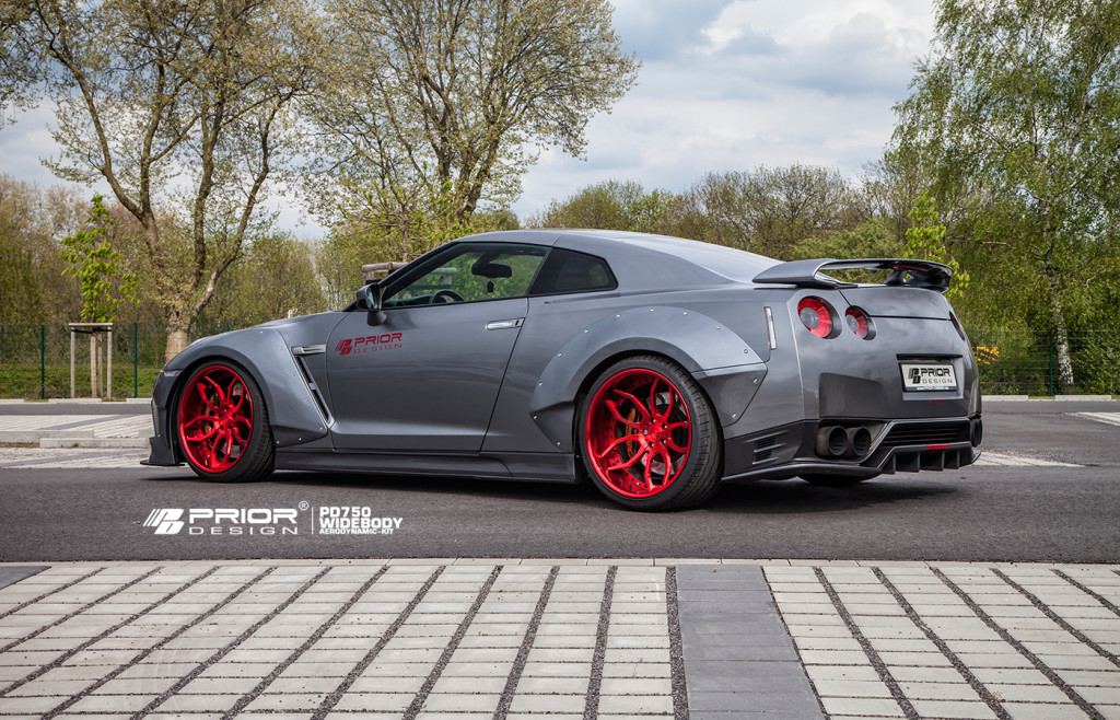 The PD750 styling package for Prior Design Nissan GT-R wide body includes 4-piece widened fenders, front bumper and front add-on spoiler, nostril-like air vents, aerodynamic side skirts, and rear diffuser. This being a wide body kit, you also have to order an air suspension system and a set of properly wide wheels and tires. Prior supplies both, and also sport exhaust system in case you fancy that too.