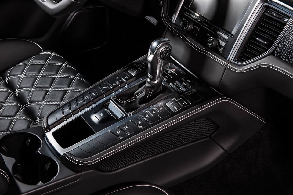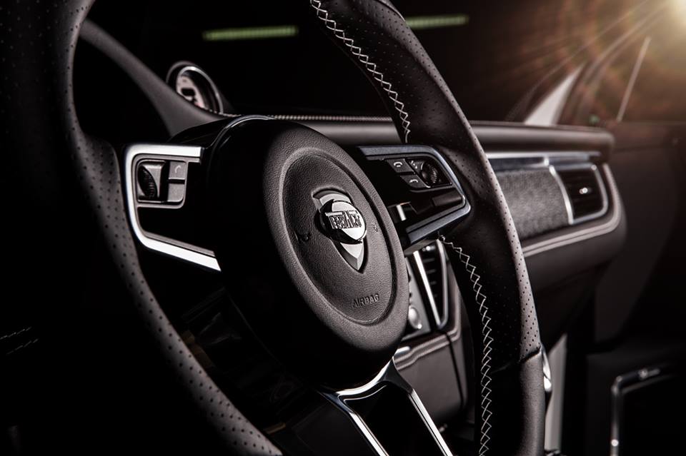 Techart Porsche Macan cockpit features a sport steering wheel with thick rim, aluminum accents, and fine leather complete with contrast stitching. One of the biggest highlights of this program is the new trim pieces with their unique textured design that is a refreshing change. Carbon fiber is getting kind of old to be honest.