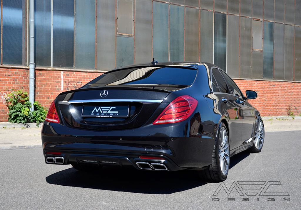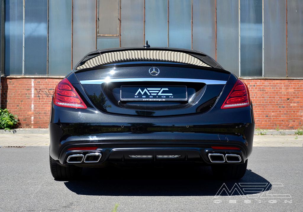 The aerodynamic styling kit MEC Design is proposing for the latest version of the Mercedes S-Class consists of a front lip spoiler, rear diffuser with AMG end pipes, rear trunklid spoiler and roof spoiler. Obviously, the parts will have a bigger visual impact if you get them in carbon finish, but you should only do that if your S-Class has a bright color. On a black car like what you see here the carbon effect just won’t show.