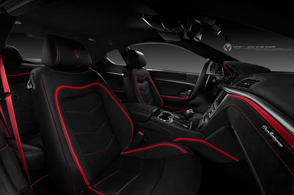 Inspired, by the looks of things, by high-end night clubs, Vilner Maserati GranTurismo gets a dark black interior garnished with red stitching and piping throughout the cabin. It’s a unique shade of red which, with that rich black as the backdrop, looks almost luminous, like it’s neon or something. Looks pretty cool.