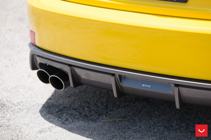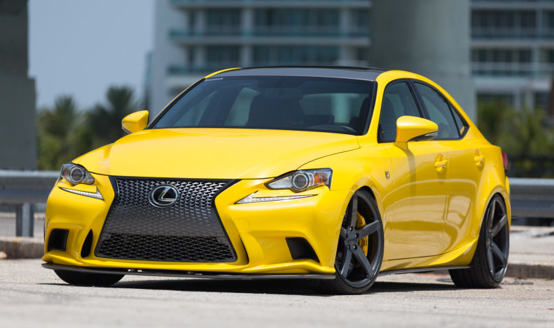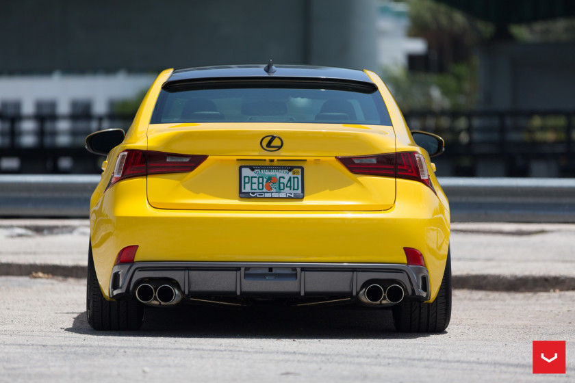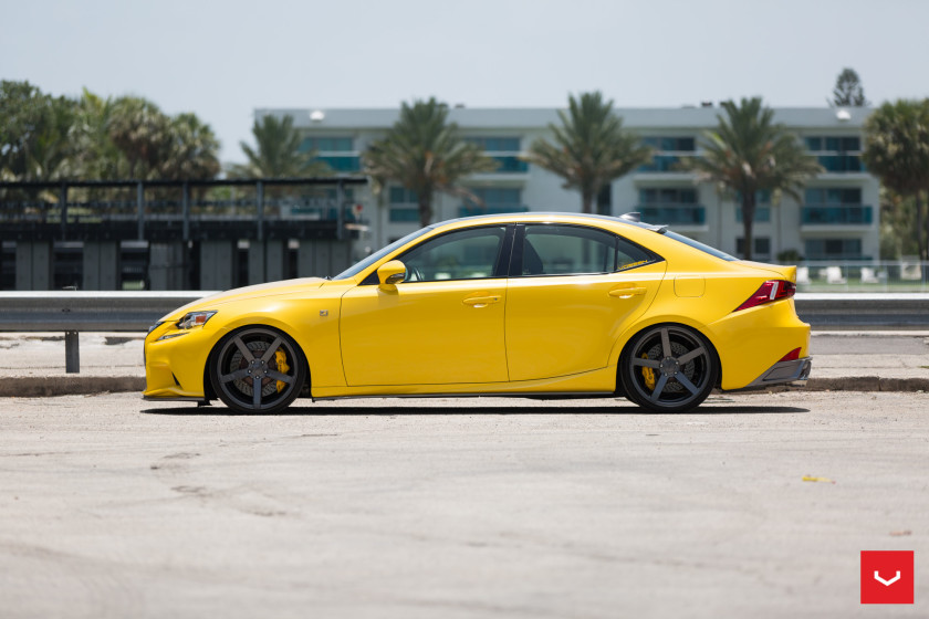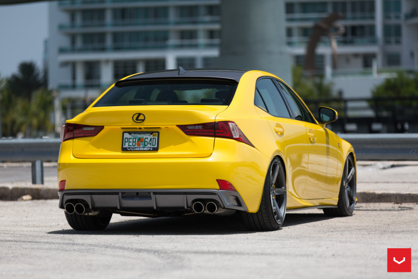 The yellow Lexus IS was first fitted with a set of multi-spoke silver rims, but in the new program Vossen has hooked up it with a set of CV3-R wheels, measuring 20×9 in the front and 20×10 in the rea, which have a simple and elegant five-spoke design and a cool gunmetal grey finish. They are a more perfect fit for the IS and complement the massive spindle grille as well as the blacked-out roof.