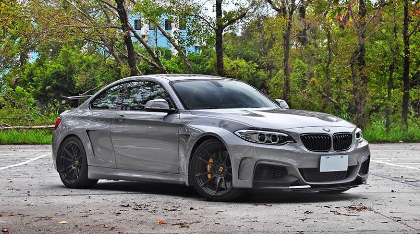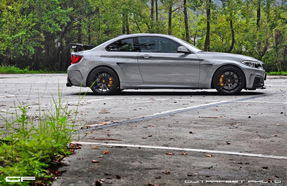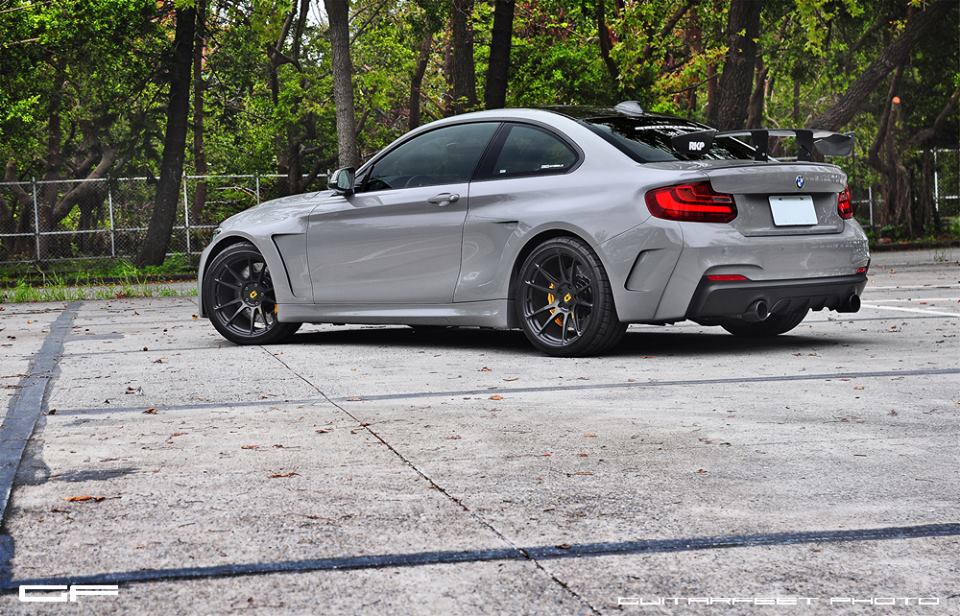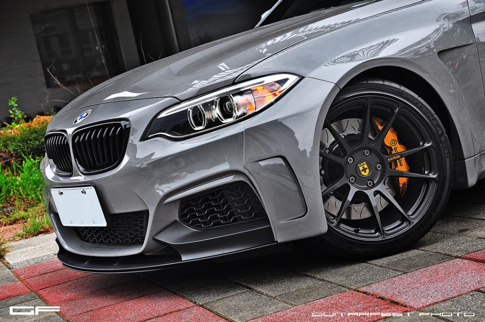 The styling kit on Manhart BMW M235i, consisting of front and rear spoilers, optional rear diffuse,r side skirts, fender extensions, and optional tall rear wing, is part of a series of modifications that make the car more track worthy. Sport suspension, uprated brakes, and a custom interior are among the others. As for the wheels this bad boy is rocking, they are a set of HRE P44SC in Satin Black which not only look good, they reduce the unsprung weight of the car and make it even more agile.