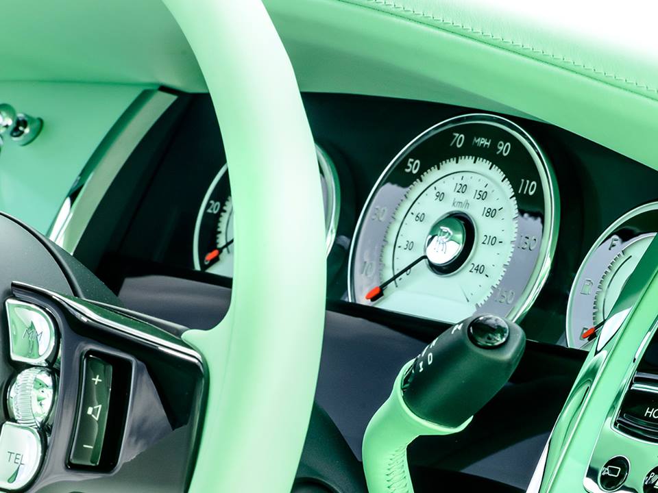 If you don’t like the one-of-a-kind shade of green this Roller is rocking on the outside, then you really should not step inside. Every single detail in side the cabin of Rolls-Royce Wraith Jade Pearl is drenched in that green – leather, veneer, lambswool floor mats, steering wheel, instrument dials, clock, even the speakers, vents and rear view mirror casing.