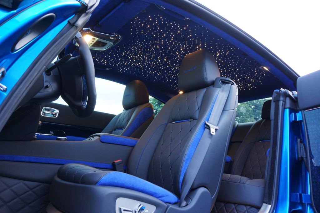Inside the cabin Mansory Rolls-Royce Wraith features a two-tone leather and Alcantara upholstery with the same bleurion-blue you find on the outside, plus blue carbon fiber trim pieces.