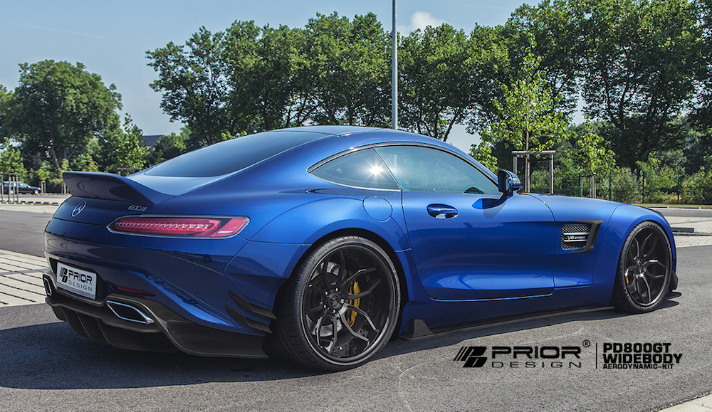 The ingredients of Prior Design Mercedes AMG GT styling kit include exclusive PD800GT front add-on spoiler, front air intake inserts, cup wings, vented bonnet, side skirts with add-on spoiler, rear diffuser, rear boot lid wing, and above all, front and rear widening.
