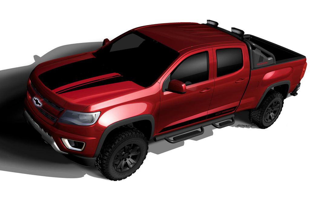 Based on a 2016 Colorado Z71 Trail Boss, the concept versions comes with a number of extras including Cargo bed-mounted sport bar with LED trail lighting, Black fender flares, Black bowtie emblems, front and rear, 17-inch black-painted aluminum wheels matched with Goodyear DuraTrac 265/65R17 all-terrain tires, G80 automatic locking rear differential, 4WD transfer case shield, Front recovery hooks, Black, three-inch round rocker steps, Spray-in bedliner, Projector beam headlamps, Front fog lamps and All-weather floor mats with the Z71 logo.