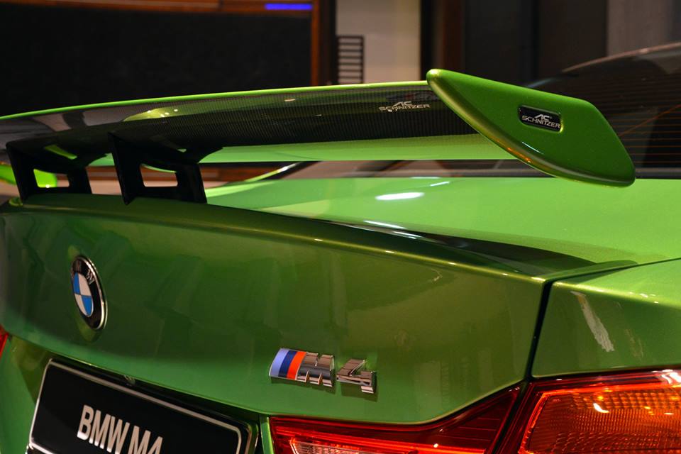 So what makes this Java Green BMW M4 such a unique proposition is the fact that it’s an amalgam of high-performance parts from the very best brands. On the styling front the car features Manhart Carbon Fiber bonnet with ventilation outlets, M Performance front carbon fiber bumper extension, M Performance side sill extensions, M Performance rear diffuser carbon fiber, and AC Schnitzer carbon fiber boot wing, all wrapped up in the super special Java Green paint job.