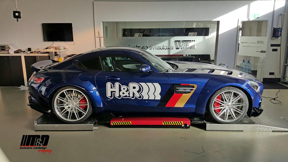 In this treatment Prior Design Mercedes AMG GT maintains its default paint scheme of deep metallic blue and carbon, but M&D garnishes it with matte black accents, German flag motifs, plus logos of Prior Design and H&R whose suspension system is a vital part of the wide body package. Without the suspension the car would look like a clown car, what with the unsightly gaps between the wheels and the fenders.