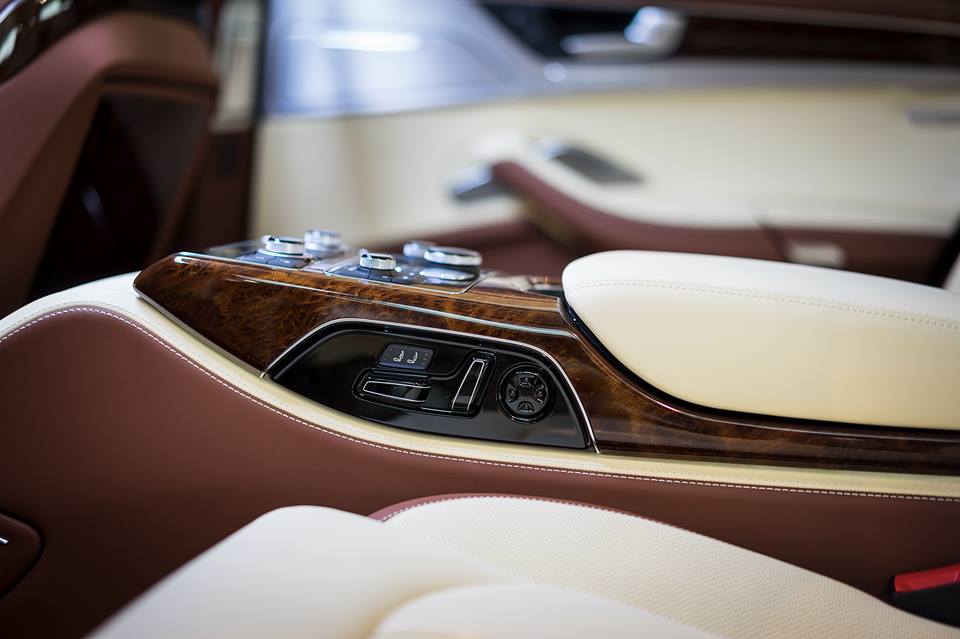 Vavona bronze wood is the dominant feature of the interior, picked straight from the Exclusive catalog, paired with Valcona brown leather complete with ornamental stitching and inlays. Together they give the cabin a warm and fuzzy feeling. The best part of Magnolia Audi A8 L Exclusive is the rear passenger compartment where you find the bespoke Rear Seat Entertainment package with headrest monitors and console controls. The two-tone leather also covers the dashboard, consoles, and door cards, but the pillars and headliners are wrapped in Alcantara.