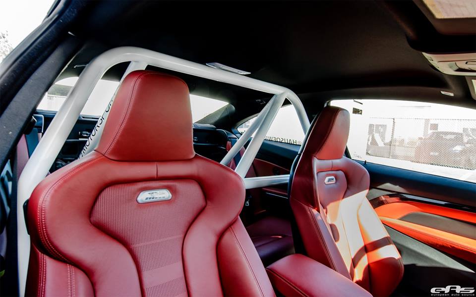 Visually, the M4 has received a BMW M Performance front splitter, Status Gruppe rear spoiler, Varis rear diffuser and a set of HRE RC103 wheels in white, shod with Toyo R888 tires. The tuner has also installed a white HG Motorsports roll bar inside the cabin which goes really well with the wheels. Interior mods also include an Awron vent gauge.