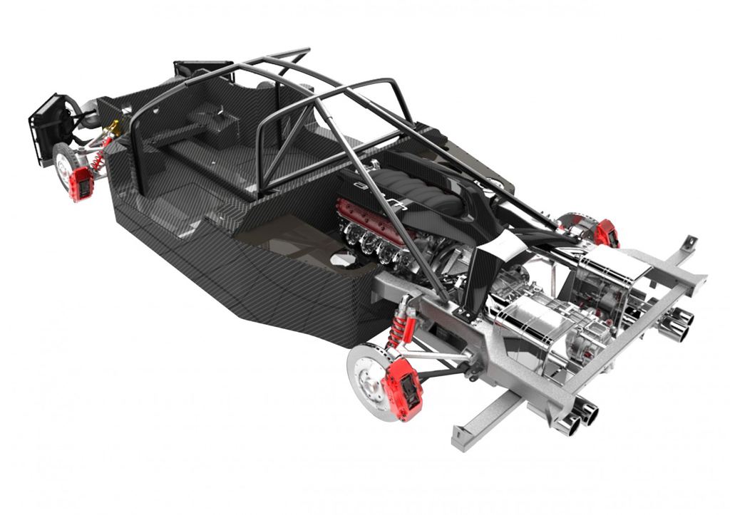 Front and rear sub assemblies in machined aluminum and Tig welded box sections. Torsional rigidity more than 60,000Nm per degree twist force.