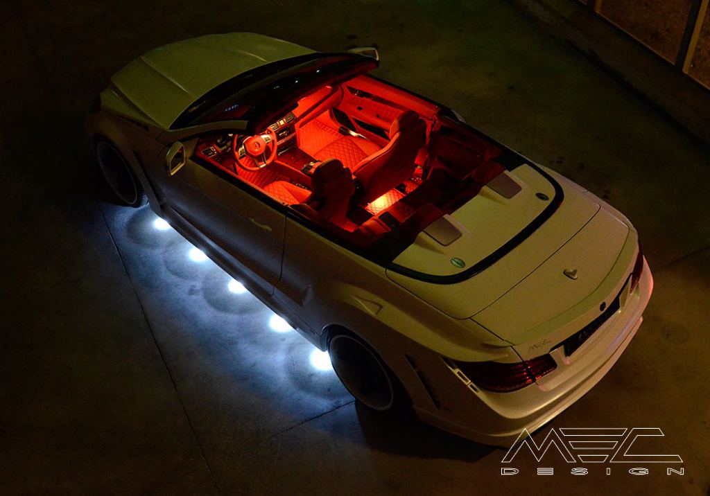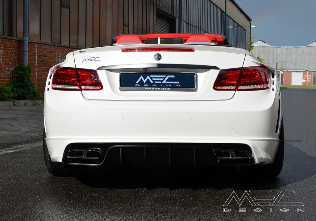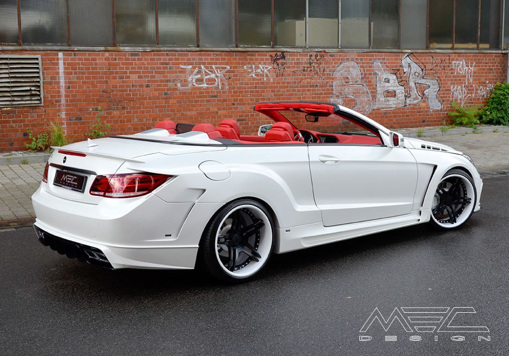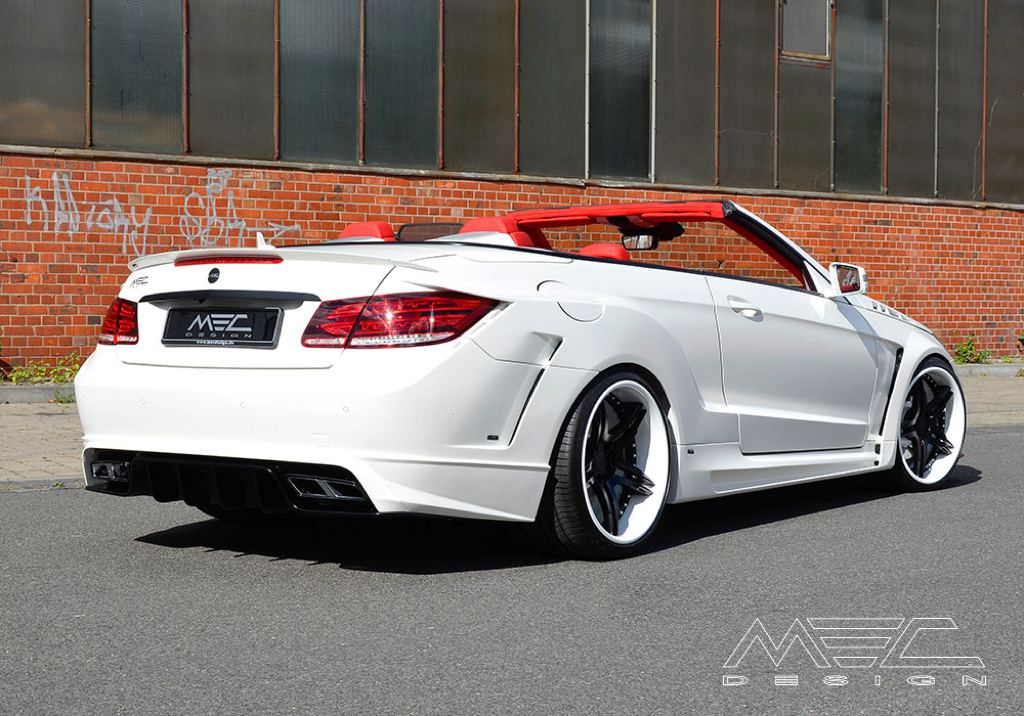 The new version of Cerberus package showcased here on this white MEC Design Mercedes E-Class Cabrio (it can also be fitted to the Coupe) features a number of exclusive parts, including front bumper with spoiler lip, rear Bumper with diffuser designed for AMG end pipes, wide front fender, side panels / fenders rear attachments, door panels, side skirts (optional with LED lights), new sport bonnet, and a 5-piece rear spoiler.