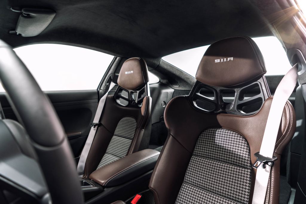 Limited to 991 units and available to order right now for £136,901 (UK pricing), the 911 R is pitched as a “wolf in sheep’s clothing” which refers to its rather simple looks that mask a vicious character. This theme continues inside with the GT sport steering wheel, short shift gearlever and carbon-backed, Pepita tartan-wrapped seats.